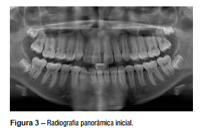 Na radiografia panorâmica inicial, observa-se características de normalidade das estruturas dentoalveolares como também a presença de todos os dentes permanentes. Verificou-se também dilaceração radicular do dente 33 e a presença dos germes dos dentes18, 28, 38 e 48 (Figura 3).