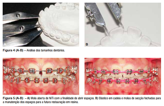 Após evolução dos fios de NiTi, foi inserido o fio 0,018” de aço e aplicadas gradativamente secções de mola aberta de NiTi para que promovesse a abertura de espaços e acomodação dos incisivos laterais com 6,33mm (Figura 5A). Uma vez posicionados nesta fase, esses espaços foram mantidos com mola de secção fechada, e utilizado o elástico corrente para o fechamento do diastema entre os Incisivos superiores (Figura 5B).