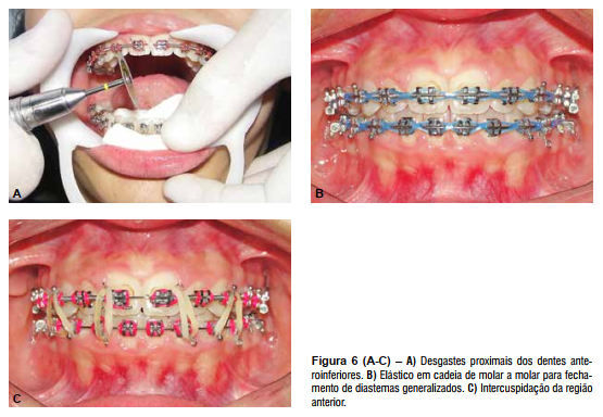 Após o fechamento do diastema, procedeu-se ao desgaste com disco diamantado dos dentes anteriores inferiores (Figura 6A) e uso de elástico corrente superior e inferior para o fechamento dos espaços generalizados (Figura 6B). Após a manutenção dos espaços nas regiões mesial e distal dos incisivos laterais superiores, iniciou-se a intercuspidação dos dentes superiores e inferiores (Figura 6C).