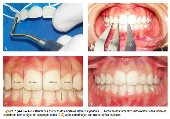 As aplicações dos conceitos estéticos de proporção áurea visam melhor padronização das dimensões dentárias, quando estas necessitam de restaurações em resina composta24. O ortodontista deve procurar ter o domínio de áreas conexas a sua especialidade com o objetivo de satisfazer o anseio do paciente que apresenta a estética como razão principal pela busca