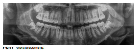 Na radiografia panorâmica, após a remoção do aparelho (Figura 8), percebeu-se o aspecto de normalidade dos dentes e estruturas adjacentes. No resultado final, observou-se uma oclusão funcional, correta relação de tamanho mésio-distal entre os incisivos superiores e inferiores, estética agradável, boa harmonia facial e, principalmente, atendido os anseios da paciente (Figura 9A-B).