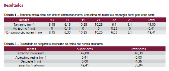 Pelos conceitos de proporção áurea ficou definido para o presente caso clínico que o tamanho dos incisivos laterais superiores no sentido mésio-distal seria 61,8% do tamanho dos incisivos centrais superiores (Tabela 1). Desse modo, o acréscimo de resina nos incisivos laterais superiores (0,18 mm no dente 12 e 0,23mm no dente 22) (Tabelas 1 e 2) proporcionou ótima harmonia estética para os dentes anterossuperiores, entretanto, foi insuficiente para conferir proporcionalidade dos tamanhos dentários entre os arcos. Isso ocorreu devido ao excesso de material dentário inferior, sendo necessário ainda o desgaste proximal dos incisivos inferiores em 4,36 mm.