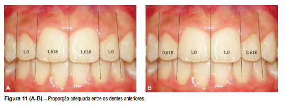 O uso dos conceitos de proporção áurea na Odontologia é extremamente simples, porém sua aplicação ainda provoca algumas dúvidas. Metodologias já foram descritas para facilitar sua utilização, e instrumentos como a régua de proporção áurea colaboram para o profissional elaborar padrões estéticos mais precisos e para determinar de maneira exata as relações de proporção entre os dentes21. A fórmula clássica da proporção áurea é uma constante que segue a razão 1: