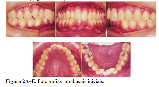 No exame clínico intrabucal o paciente apresentava oclusão de Classe I com desvio da linha média superior de 1 mm para a direita, e um trespasse vertical anterior de 5mm com apinhamento anteroinferior, os dentes apresentavam-se íntegros quanto ao tamanho, forma e estrutura(Figura2 A-E).