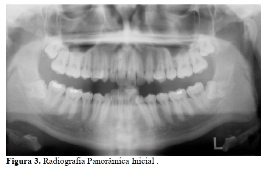 Na radiografia panorâmica foi observada a presença de angulação distal das raízes dos caninos inferiores. Foi possível notar ainda a presença dos dentes inclusos 18 (terceiro molar superior direito), 28 (terceiro molar superior esquerdo) 38 (terceiro molar inferior direito) e 48 (terceiro molar inferior direito), e as restaurações nos dentes posteriores. Não foi notada nenhuma alteração significante nas estruturas adjacentes aos dentes (Figura 3).