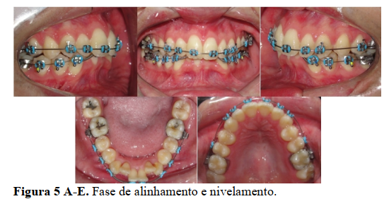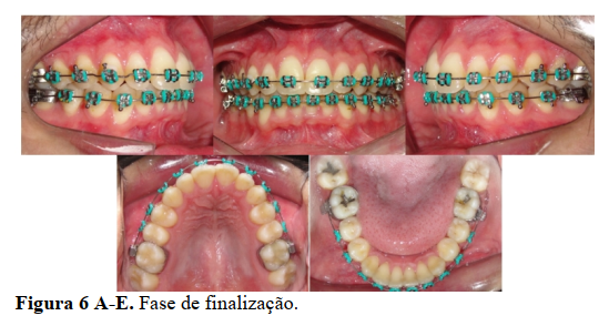 Na fase de finalização para melhor intercuspidação e corrigir o mau posicionamento foi feita dobra de extrusão no dente 13 (Figura 6A-E).