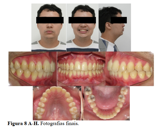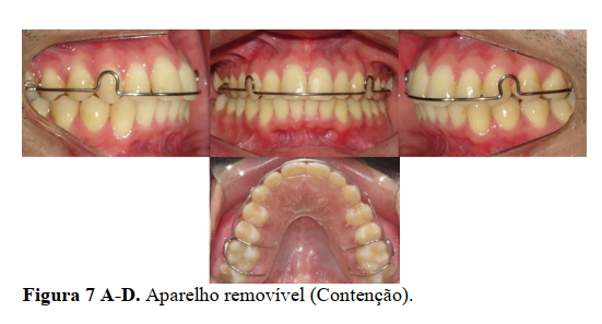 Após remoção do aparelho ortodôntico, foi instalada no paciente uma placa de Hawley superior, e contenção 3X3 inferior (Figura 7 A-D).
